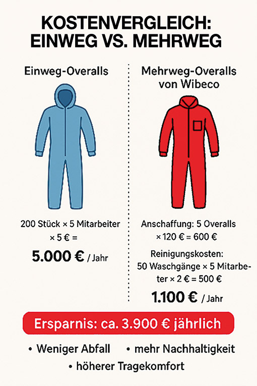 Ein mittelgroßer Lackierbetrieb mit 5 Mitarbeitern benötigt pro Person ca. 200 Overalls pro Jahr.