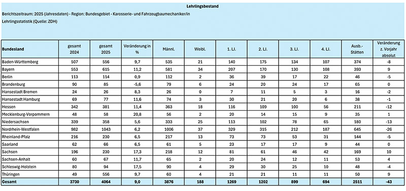 Die aktuelle Ausbildungsstatistik des ZDH liefert erfreuliche Nachrichten. Mit einem Zuwachs von 9 % ist die Gesamtzahl der Auszubildenden im Karosserie- und Fahrzeugbauerhandwerk von 3.730 auf 4.064 im Vergleich zum Vorjahr gestiegen.