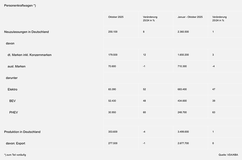 Im Oktober 2025 wurden auf dem deutschen Pkw-Markt mehr Fahrzeuge neu zugelassen als im Vorjahresmonat. Im Vergleich zum Vorjahresmonat stieg die Zahl der Pkw-Neuzulassungen um 8 Prozent auf ein Volumen von 250.100 Einheiten. In den zehn Monaten des Jahres wurden insgesamt 2,4 Mio. Pkw neu angemeldet. Damit ist die Zahl der Neuzulassungen im Vergleich zum entsprechenden Vorjahreszeitraum um 1 Prozent gestiegen. Der deutsche Pkw-Markt bleibt damit jedoch weiterhin deutlich unterhalb des Niveaus des Jahres 2019: In den ersten zehn Monaten des letzten Vor-Corona-Jahres lagen die Neuregistrierungen von Pkw in Deutschland noch um 22 Prozent oder rund 664.300 Einheiten höher als aktuell.